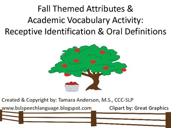 Next, there is an activity to practice identifying fall words when given attributes or verbally defining words with attributes. Kids also have an opportunity to practice identifying English/Language Arts vocabulary by attributes (definitions) and orally defining them as well. I recommend that kids may earn bingo chips to cover up words on their vocabulary mat when they get a question right. The kid that answers the most questions correctly is the winner! I have included SLP question prompts so you can easily read the attributes/definitions.