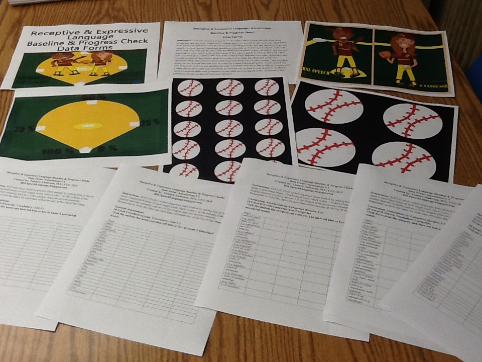 I am excited to share that I have completed receptive and expressive language packets that include baseball themed data collection forms to address synonyms & antonyms, associations, multiple meanings, and irregular plural nouns/irregular past tense verbs. I decided to create these materials because I have several activities to use when providing speech-language services for my students.  Although my students love when I use different games and activities to target their vocabulary and grammar activities, the words elicited are not always the same each session and I needed a way to effectively measure their language progress over time.