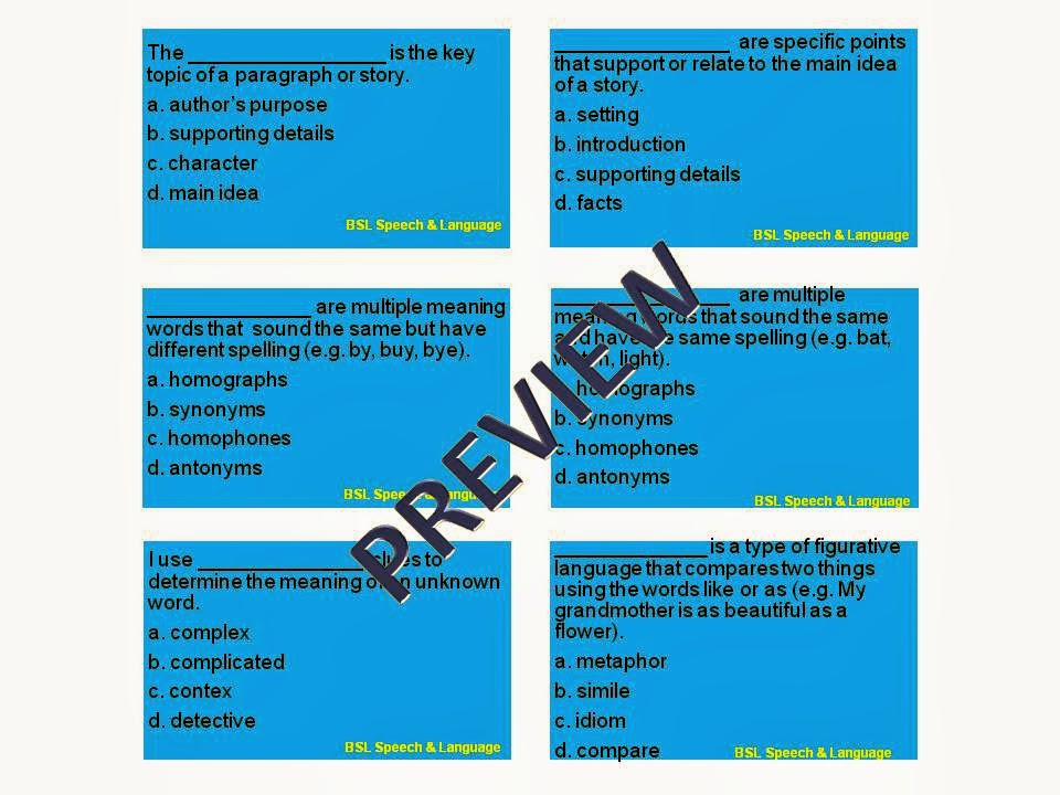 This school year, I plan to give my 2nd, 3rd, 4th, and 5th grade English/Language Arts Common Core Standards Vocabulary packet questions to my students in order to collect baseline data at the beginning of the year. I will note my students’ areas of mastery and needs so that I may effectively plan and implement future speech-language therapy lessons. These learning packets/task cards may also be used to review skills throughout the year and then as a reassessment prior to end of year state testing.